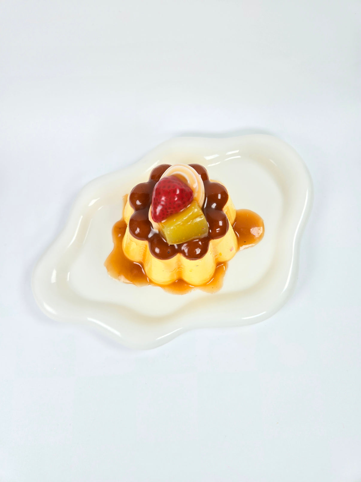 Realistic caramel flan shape with glossy top and fruity garnish